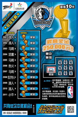 顶呱刮“NBA总冠军票”系列彩票为10元面值,最高奖金25万。该系列共有6张彩票,票面分别以2001-2011年登上NBA总冠军宝座的湖人、马刺、活塞、热火、凯尔特人和小牛队等6支最著名球队的队徽为主题,球队队徽与NBA总冠军奖杯在票面上交映生辉,这也是此款票的最大特色。