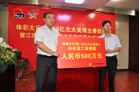 今年6月27日,我省昆山彩民中得体彩超级大乐透第12074期2.56亿元巨奖,在领奖当日,该彩民委托省体彩中心,向希望工程捐款500万元。省体彩中心与省希望工程办公室根据捐赠人的意愿,经过协商,决定依托这笔500万元善款,成立“江苏省希望工程体彩助学基金”,用于改善江苏省内经济薄弱地区基础教育状况。这笔助学基金将用于三年内在我省捐建10所体彩希望小学,同时对希望工程图书室、希望工程电脑室、希望工程快乐体育操场、希望工程快乐体育器材室、希望工程快乐音乐教室以及培训希望小学教师等资助项目进行援助。