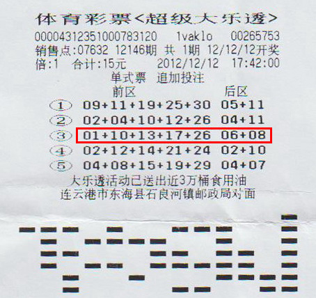 这两张中奖票均为大乐透12146期,站点同为连云港07632站点,票面所有号码都一样,都是5注单式,其中第3注号码“01 10 13 17 26+06 08”为当期的中奖号码。只不过一张是10元票(中500万),另一张是追加的15元票(中800万)。10元的出票时间为12月12日17:41:46,而15元出票时间为12月12日17:42:00,仅仅相差了14秒。从票面和出票时间来看,很容易让人认定这两张票必然是一人所中。这两张票由一人投注确实不假,但令人感到诧异的是,所有者却分别归属了两个人。